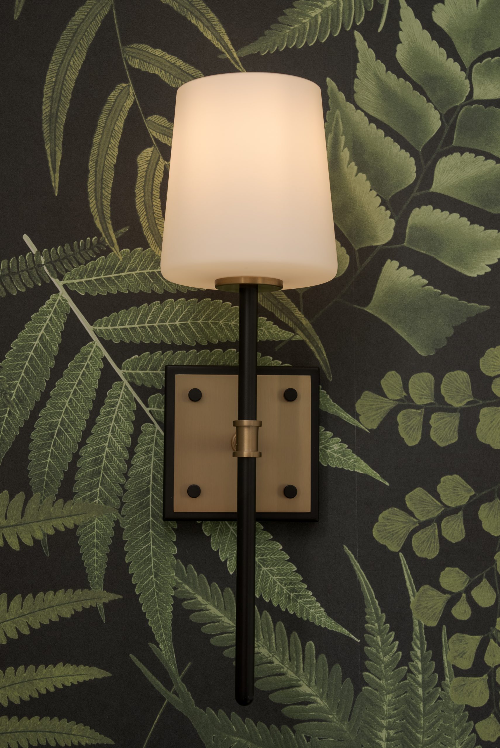 Anchored by deep sage cabinetry and adorned with warm brass fixtures, the vanity becomes a statement of subdued luxury. A lush botanical wallpaper brings life and movement to the space, while the black stone countertop offers contrast and grounding presence. Every element — from the arched mirror to the gold wall sconces — was curated to elevate the room’s ambiance while ensuring practical day-to-day use.