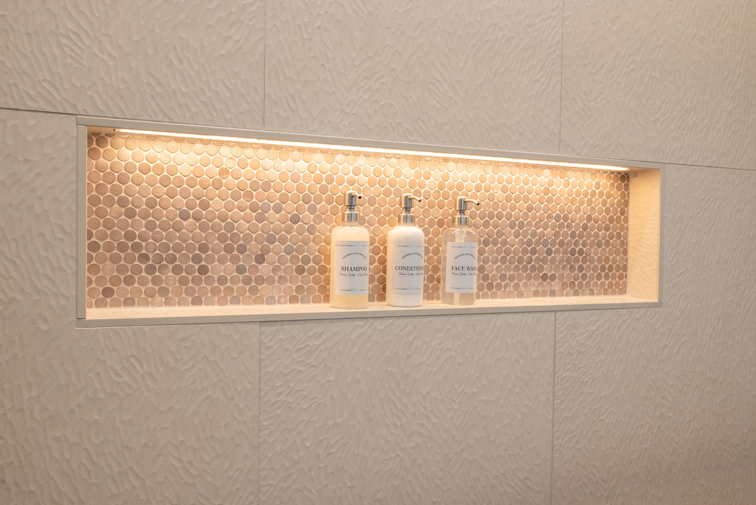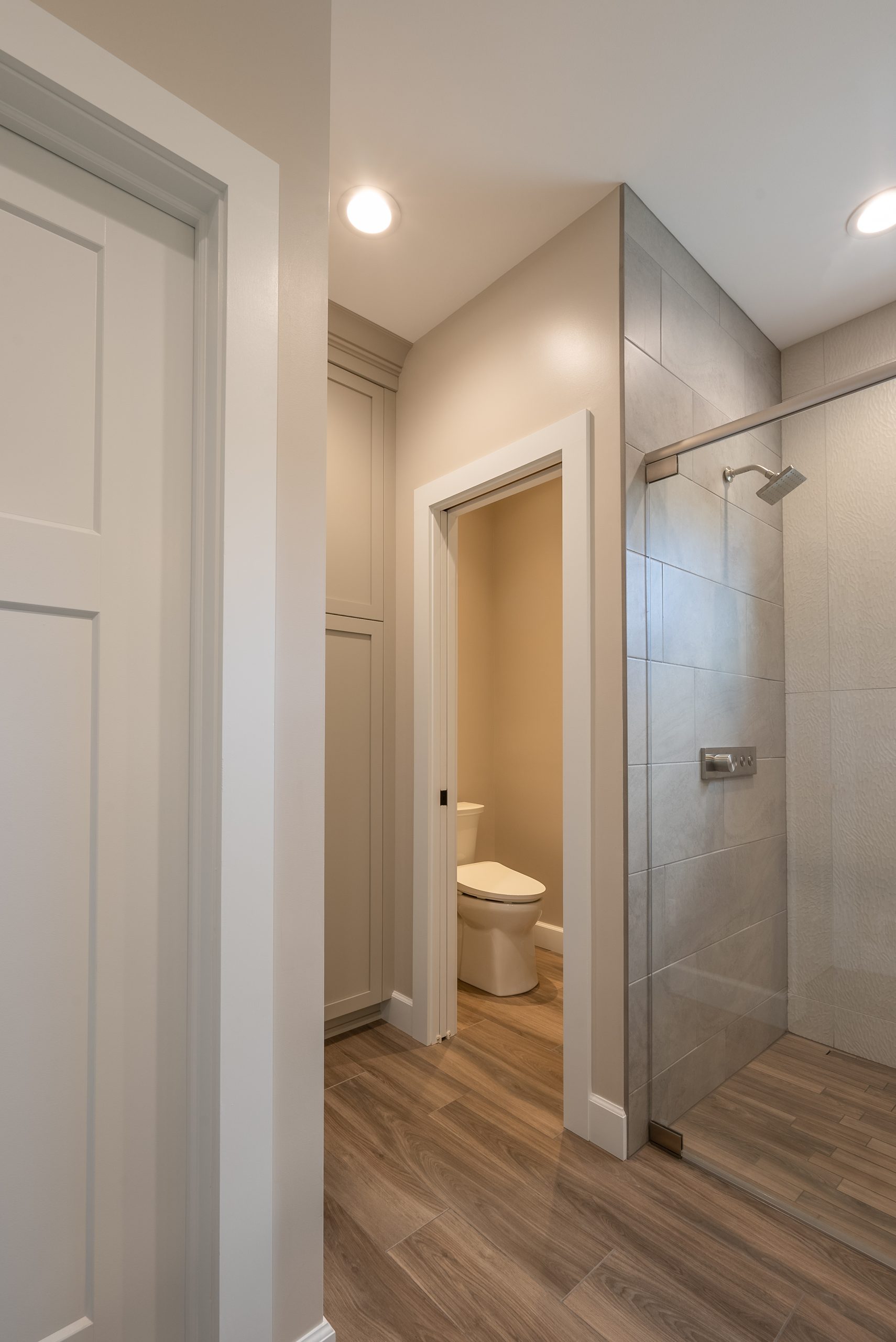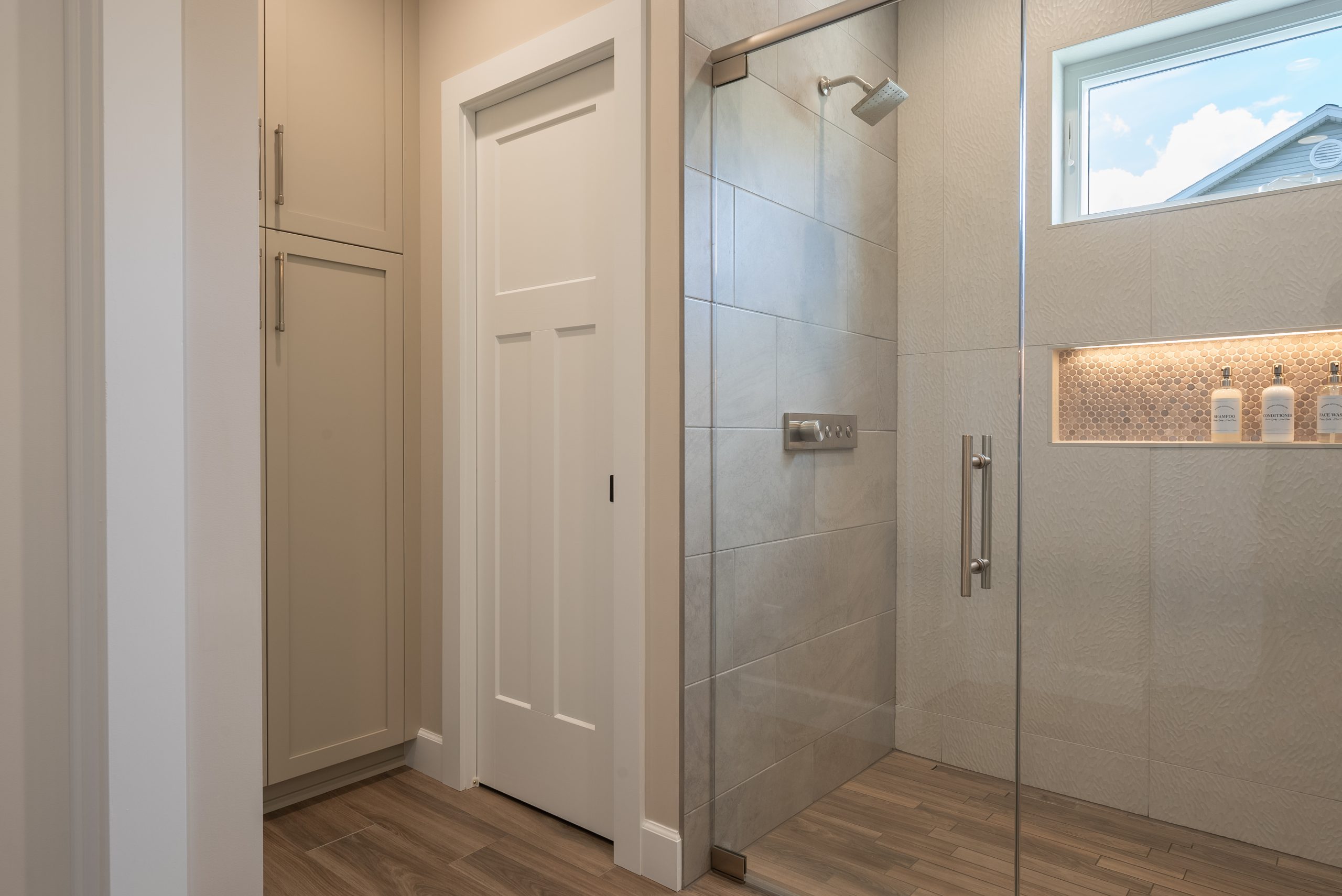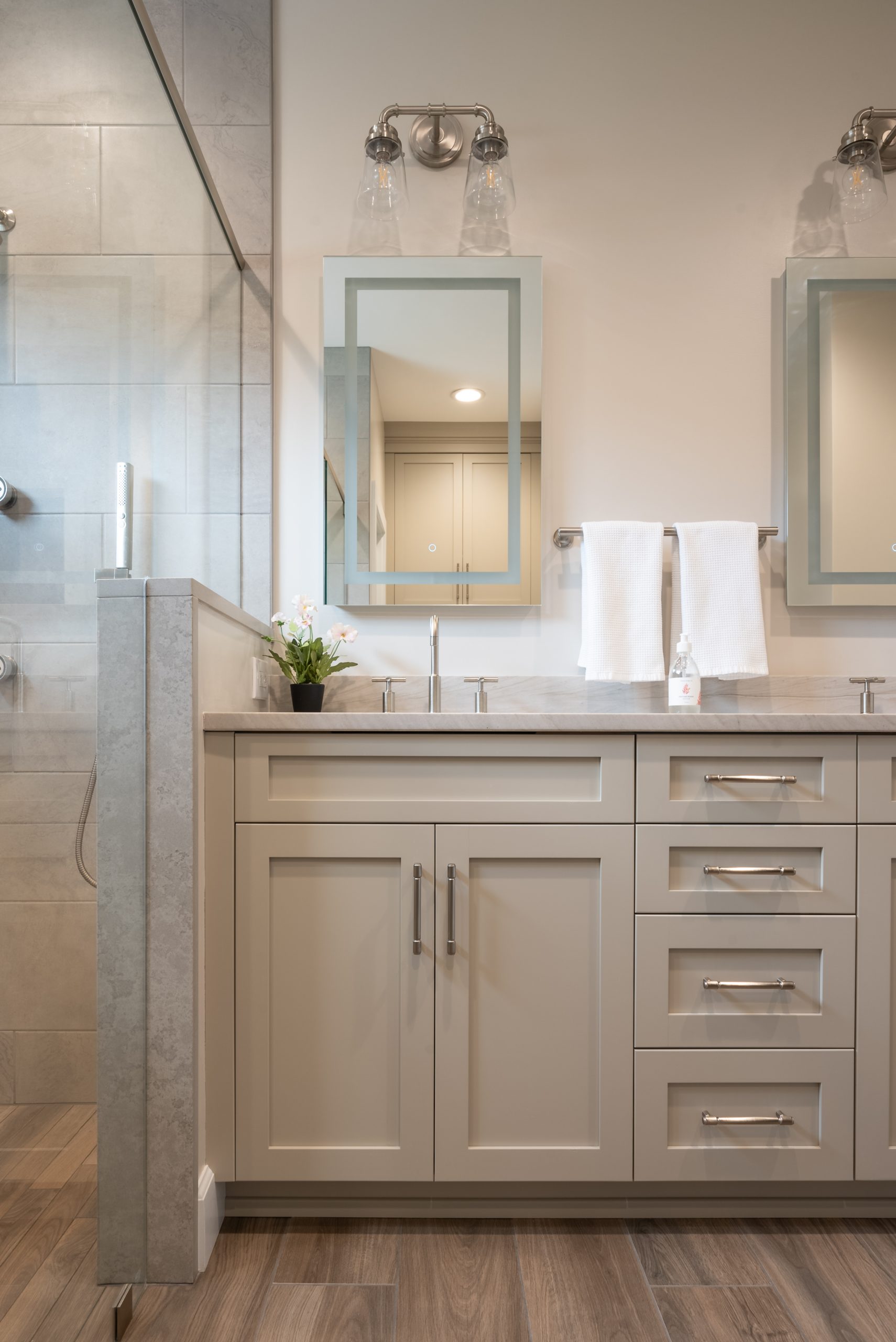 To enhance the calming atmosphere, we curated a mix of soft, neutral tilework with subtle textures that reflect spa aesthetics. Warm wood-look flooring grounds the space, while brushed nickel fixtures, clean white cabinetry, and backlit mirrors add a polished, contemporary finish.