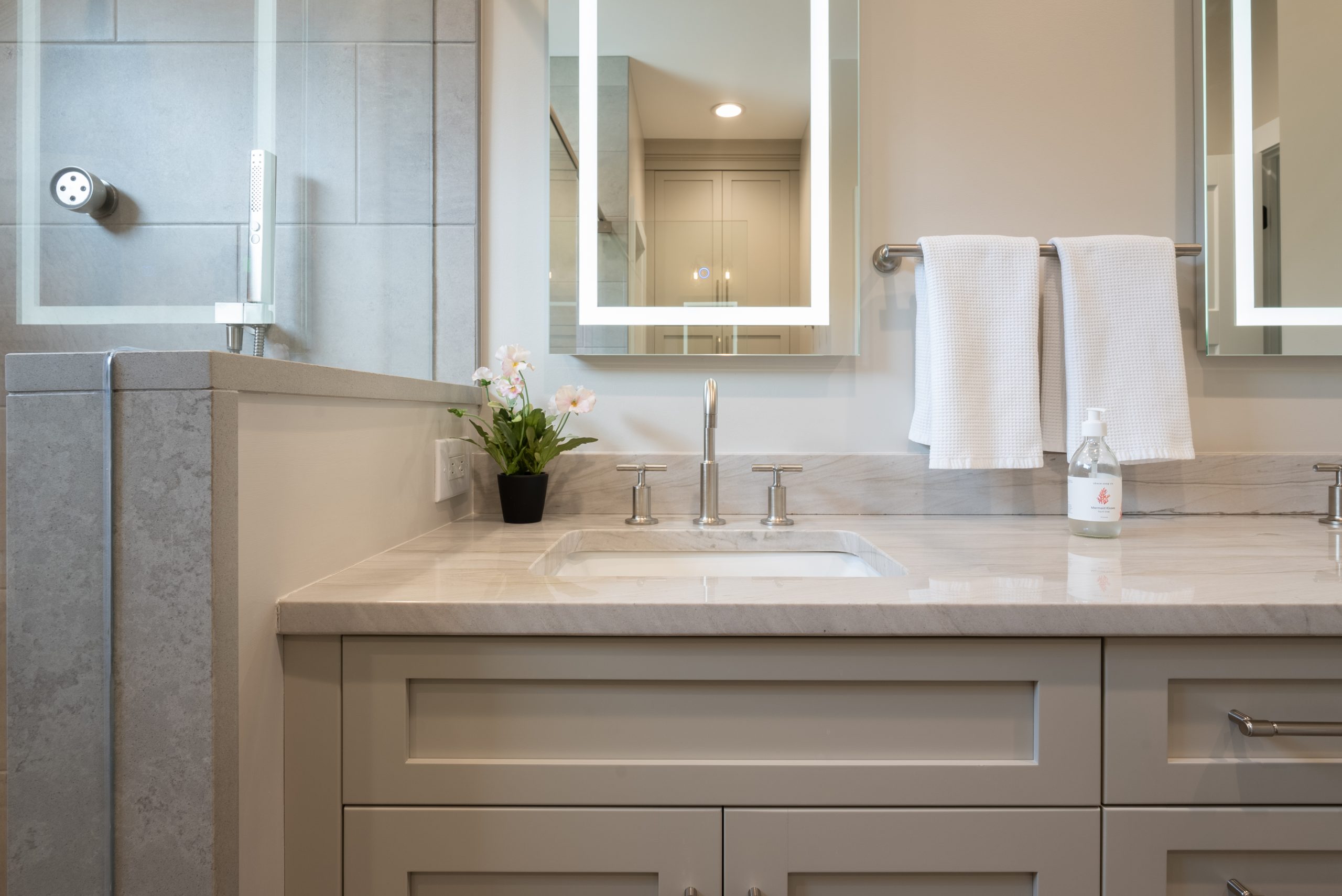 A bulky soaking tub was removed to make room for a luxurious double shower, complete with dual shower heads, a sleek handheld sprayer, and custom lighted niches that blend elegance with daily convenience. This new focal point transformed the overall feel of the room, offering both beauty and practicality.