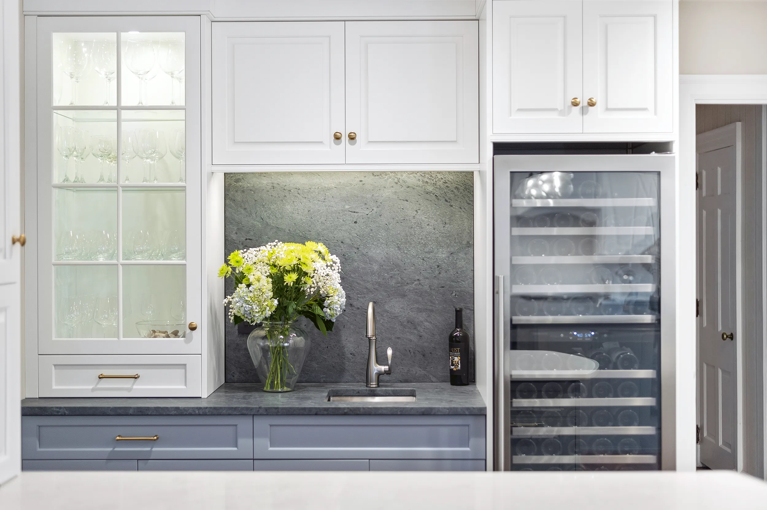 Two contrasting countertop materials—sleek white quartz and rich gray Barroca soapstone—complement the custom cabinetry and elevate the overall design. The result is a kitchen that feels both luxurious and livable, with a look that’s as elegant as it is enduring.