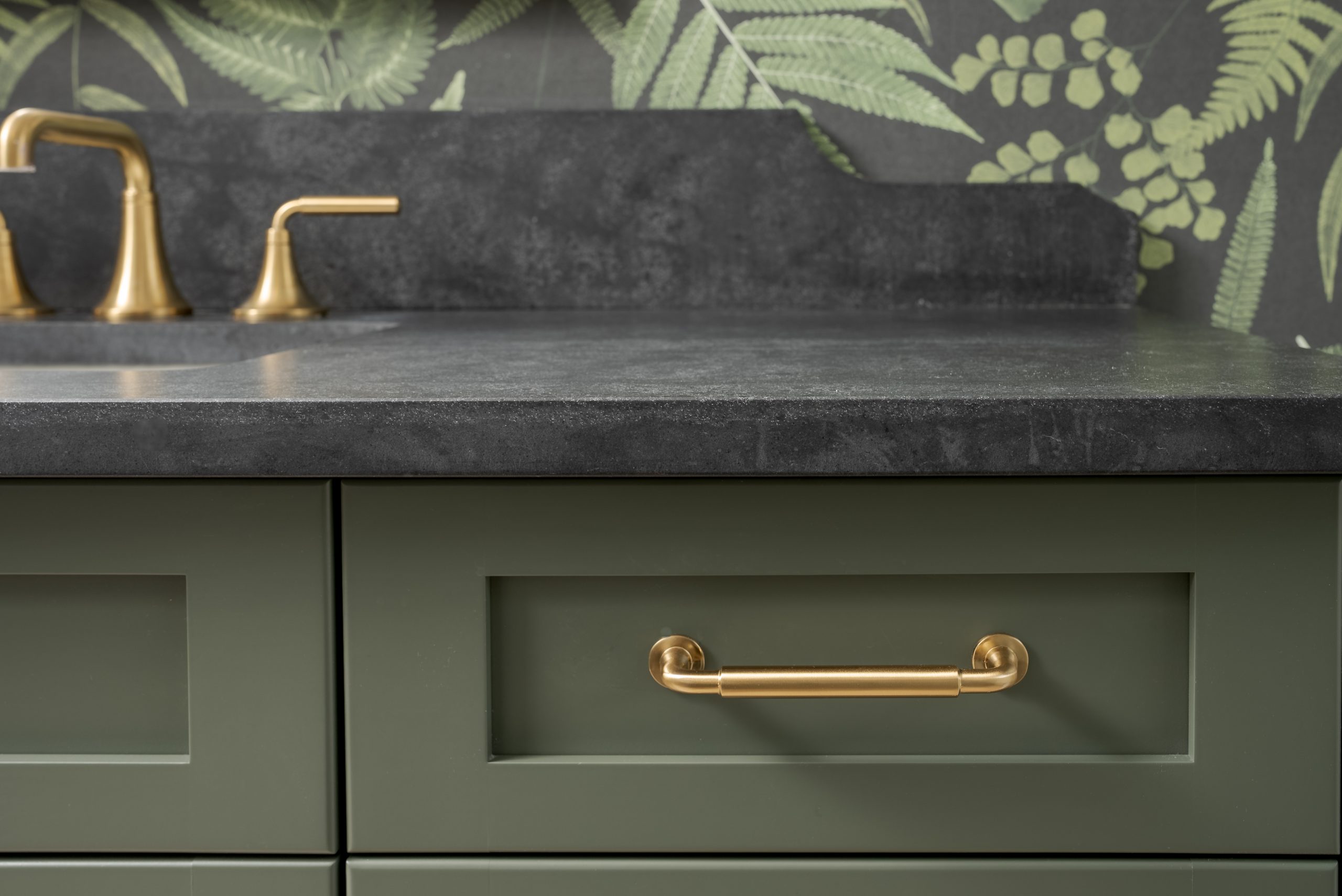 Anchored by deep sage cabinetry and adorned with warm brass fixtures, the vanity becomes a statement of subdued luxury. A lush botanical wallpaper brings life and movement to the space, while the black stone countertop offers contrast and grounding presence. Every element — from the arched mirror to the gold wall sconces — was curated to elevate the room’s ambiance while ensuring practical day-to-day use.