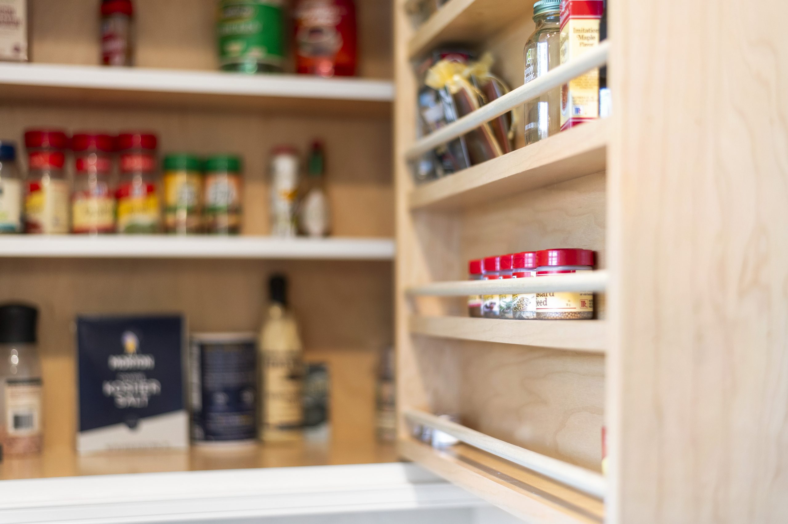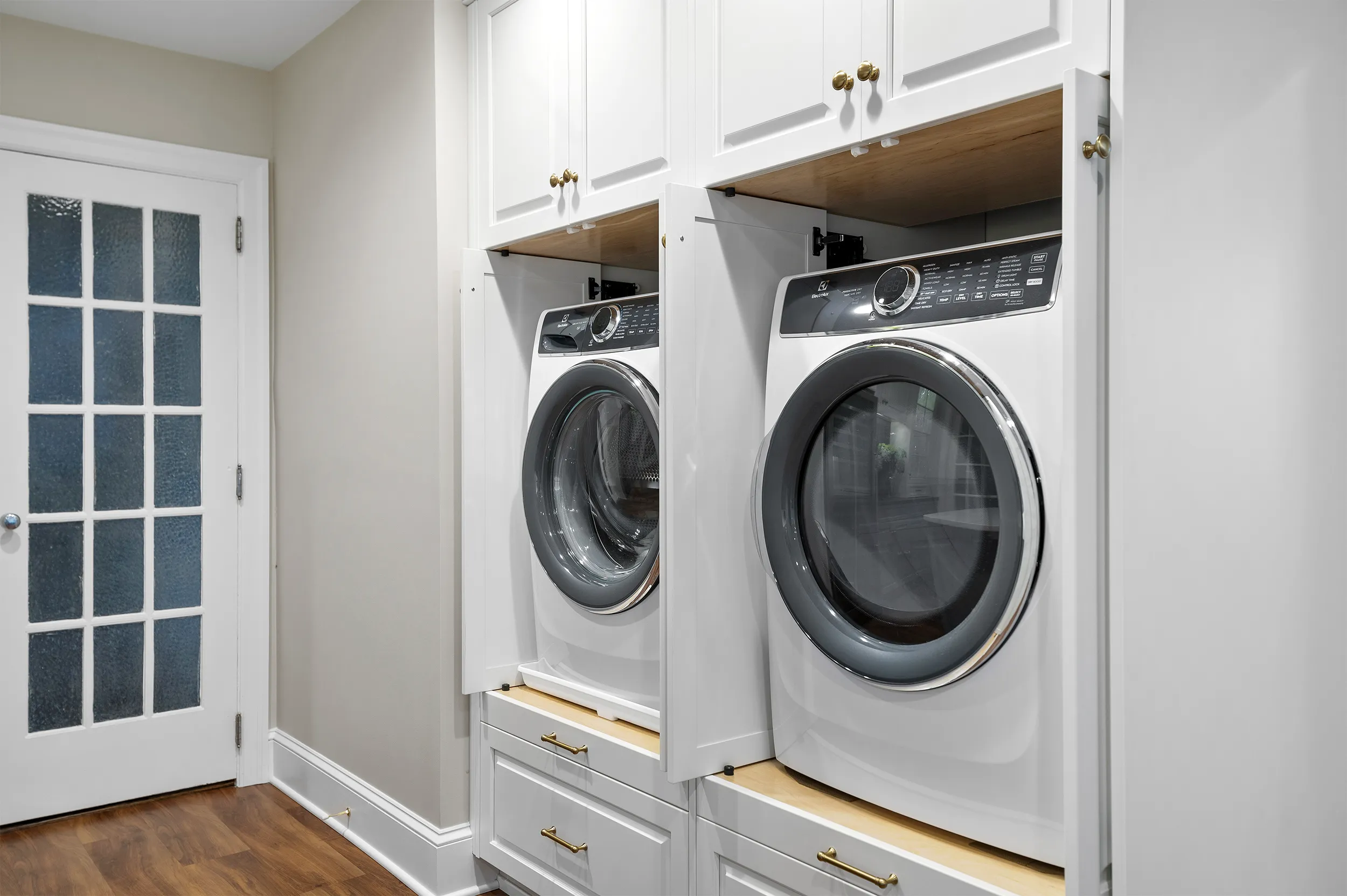 Our team relocated the washer and dryer from the basement to the kitchen, building custom cabinetry that discreetly hides the appliances while adding valuable storage.