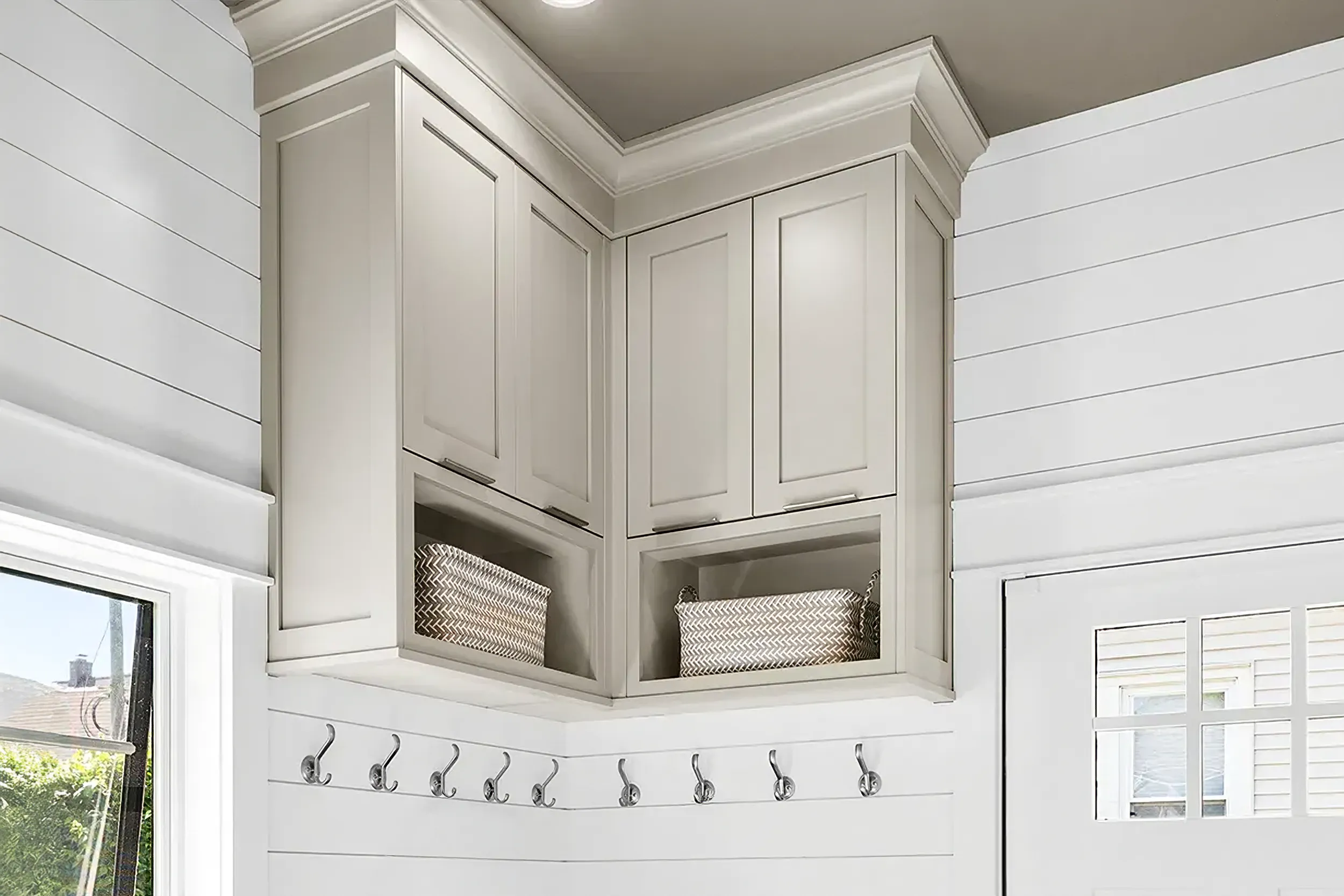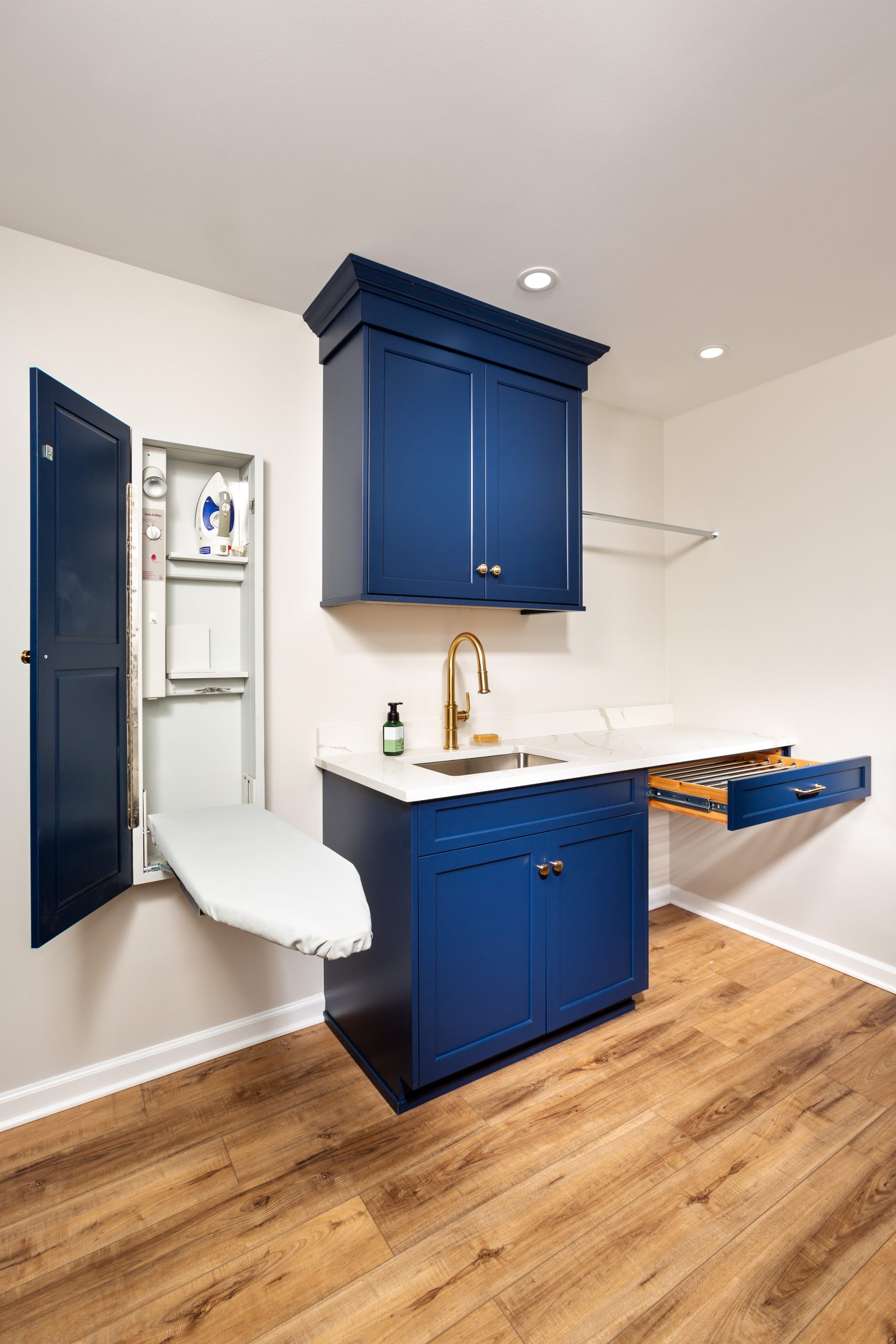 When making design choices for projects, it is always our goal to find innovative space-maximizing solutions, and create conveniences that align with the clients’ lifestyle. In trying to keep the sink centered at the window, we had to get creative with the cabinet layout and incorporated a “blind corner” cabinet. We added an “optimizer” to allow the client to use as much of the cabinet as possible. The homeowners do a lot of cooking, and making sure we had a large range top with multiple burners and plenty of drawer space for pots/pans storage along with utensils and spices was very important in the design. The homeowners tend to hang dry lots of laundry, so we incorporated a hanging rod and hanging drawer. We were also able to install a wall mounted ironing board, and order a door to match the rest of the cabinetry.