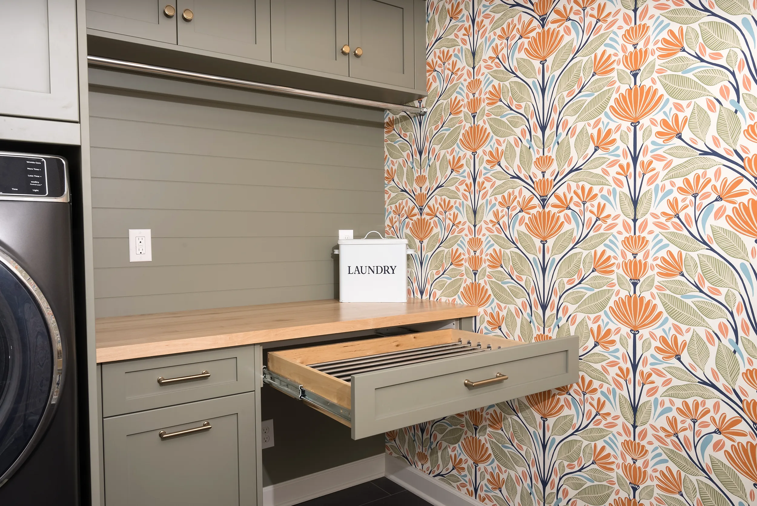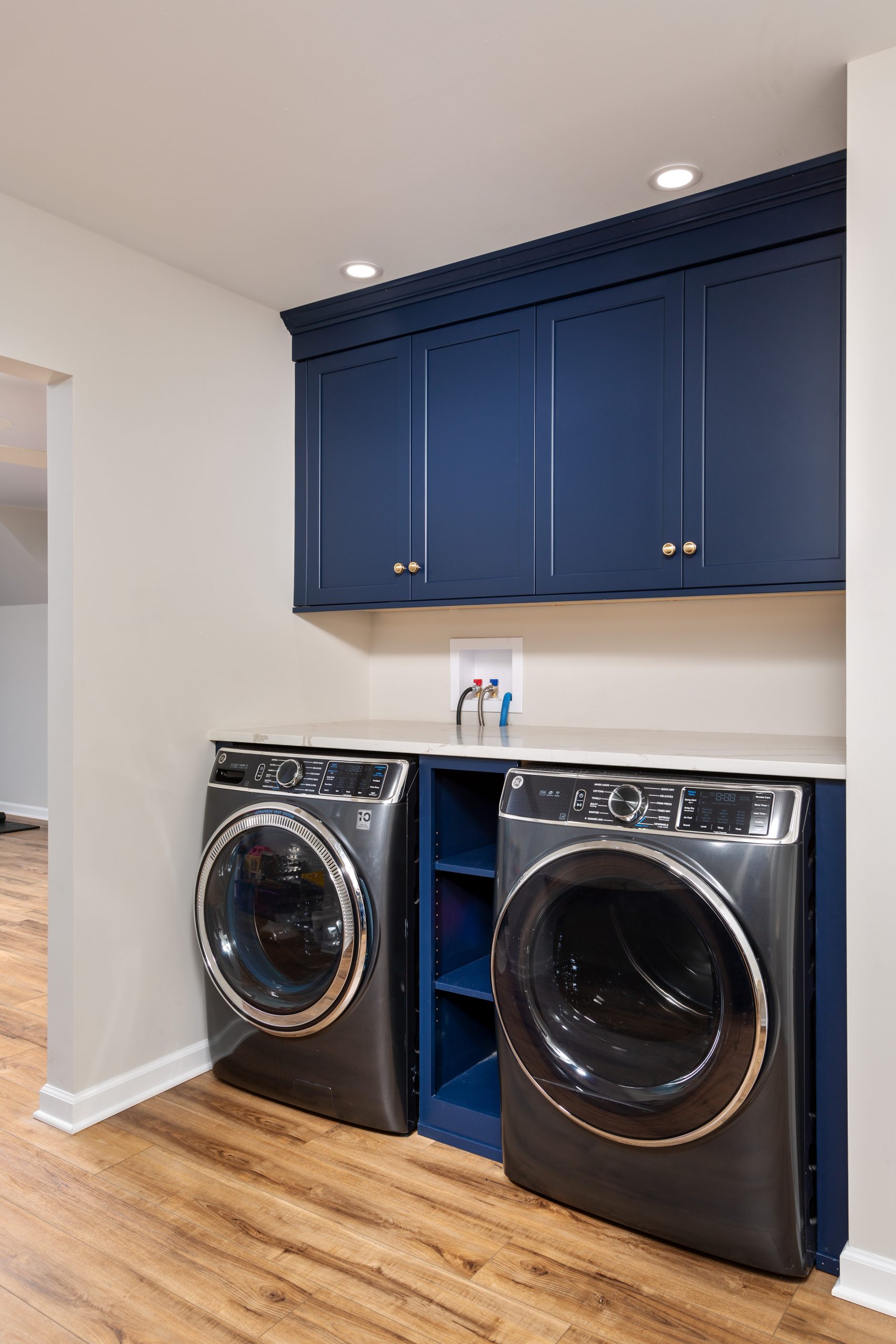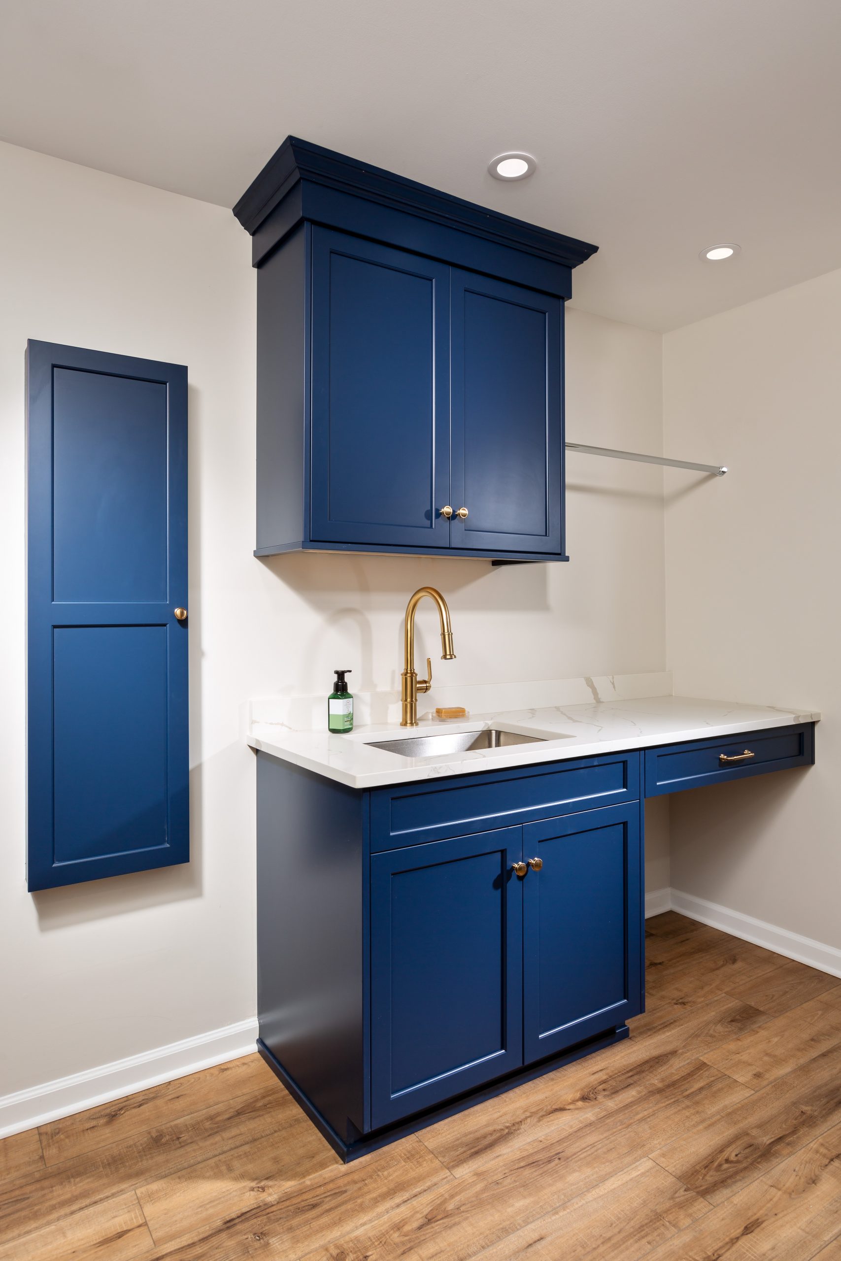 No detail was overlooked when it came to this renovation. We strove to make all of the spaces feel connected without being adjacent. The cabinet color in the kitchen and mudroom were the same “Accessible Beige” by Sherwin Williams, and the bench top in the mudroom matches the accented island cabinetry. While the laundry room was upstairs, it still felt connected to the kitchen and mudroom.