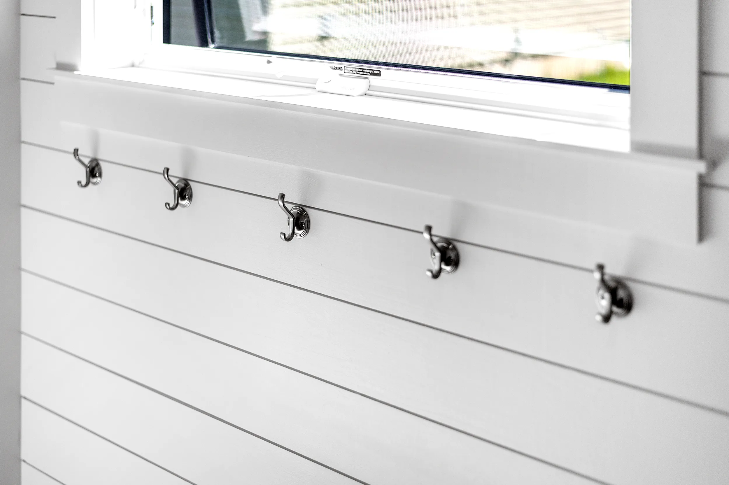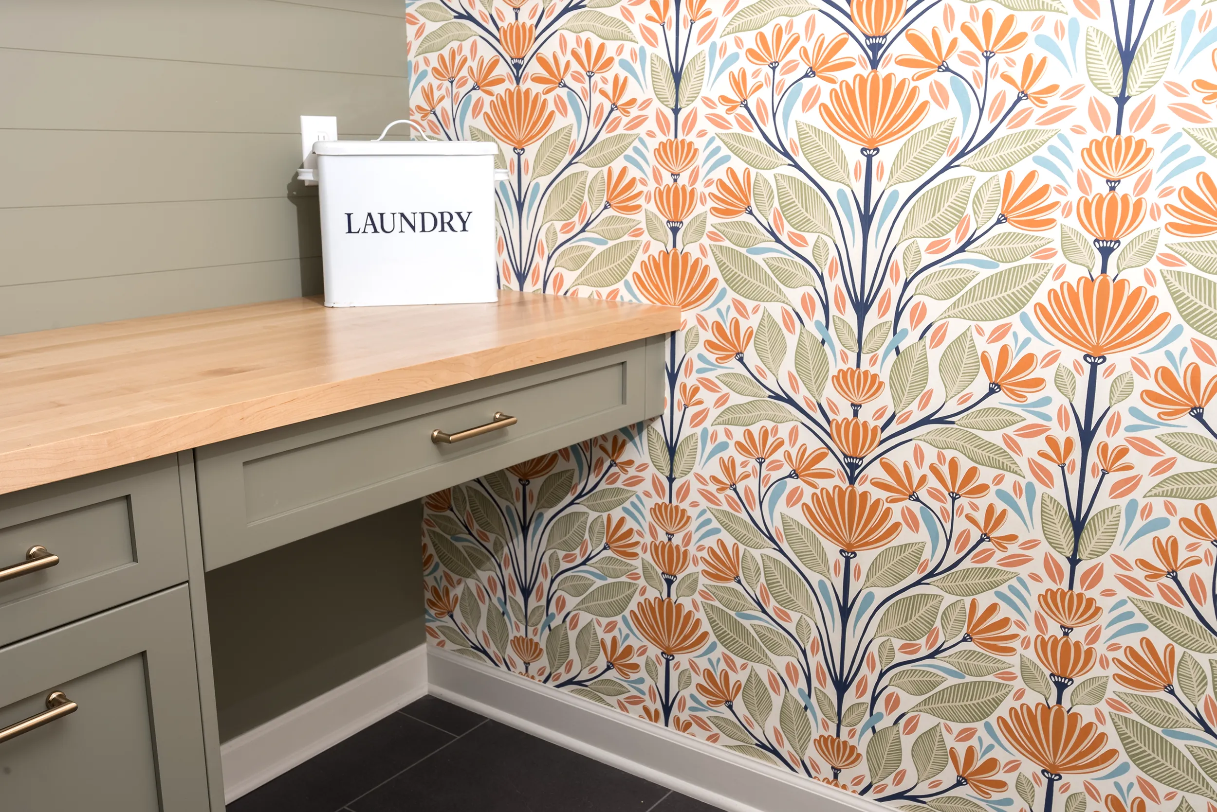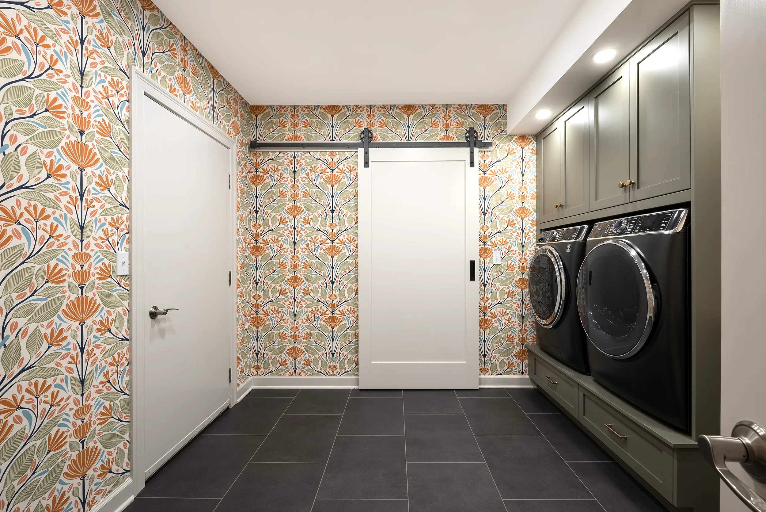No detail was overlooked when it came to this renovation. We strove to make all of the spaces feel connected without being adjacent. The cabinet color in the kitchen and mudroom were the same “Accessible Beige” by Sherwin Williams, and the bench top in the mudroom matches the accented island cabinetry. While the laundry room was upstairs, it still felt connected to the kitchen and mudroom.